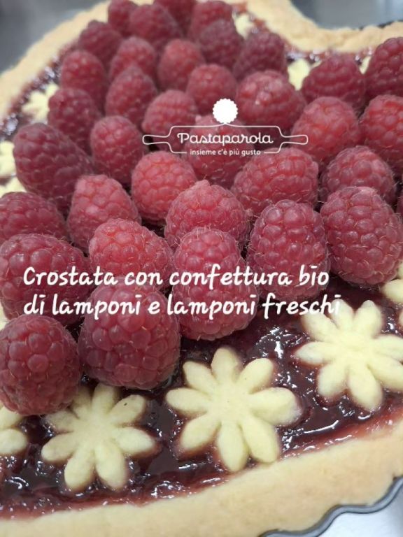 Un morbido guscio di pastafrolla accoglie un generoso strato di confettura di lamponi bio. Decorata a freddo con lamponi freschi, questa torta, semplice nella sua struttura, ha un effetto scenografico assicurato, tanto da farne una torta adatta ad occasioni importanti.