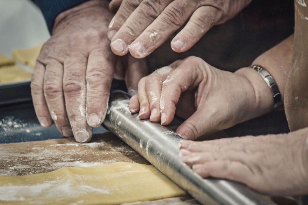 Le nostre mezze maniche sono fatte interamente a mano. Si prepara la stessa sfoglia sottile usata per gli anolini e la si arrotola attorno ad un cordocino di ripieno a base di pane grattugiato, Parmigiano Reggiano e uova, sovrapponendola quel tanto che basta per evitare che si apra in cottura. A seguire si tagliano dei tocchetti di pasta di 2 cm circa. Ecco fatte le nostre mezze maniche ripiene.